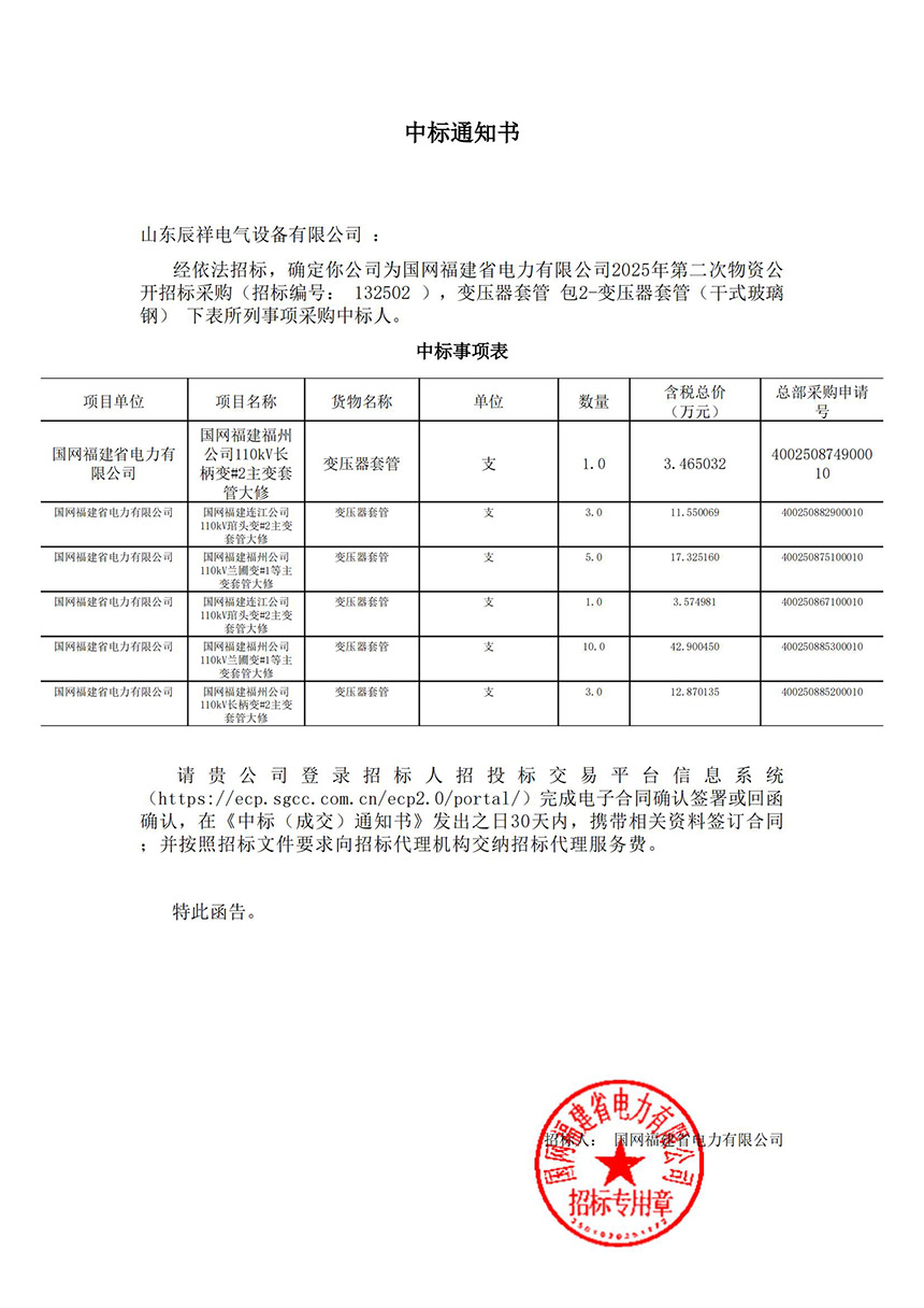 • 2025.02.14 110kV瓷絕緣穿墻套管中標通知書